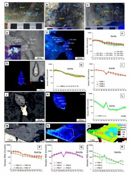 (1)Sch1以浸染状赋存于二长花岗斑岩和花岗斑岩中,颗粒形态多为次圆至他形,在紫外光照射下呈现均匀的蓝色荧光。Sch1主要与斜长石、钾长石、磷灰石、金红石等矿物共生(图2)。Sch1富含稀土元素,其∑REE+Y值介于1471 ppm至4059 ppm之间,表现出轻稀土元素(LREE)富集的特性,并伴有显著的Eu负异常(图2H-I)。Sch1的沉淀过程与早期岩浆热液有关,继承了阳储岭岩浆岩中LREE富集、HREE亏损以及Eu负异常的特征。