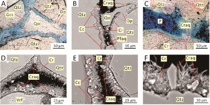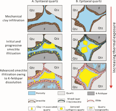 本次研究首次识别出与伊利石颗粒包壳形成演化有关的三种类型自生石英:1)石英次生加大边(Qo):仅发生在包壳缺失或不连续处,沿碎屑石英表面生长;2)伊利石边缘附着石英(Craq):呈短柱状,紧贴伊利石rim生长,晶体大小与边缘厚度同步演化;3)锯齿状石英(Saq):位于伊利石包壳外围孔隙中,晶形规则,常呈锯齿状接触边缘,并逐渐充填孔隙。上述石英胶结的分布和形貌表明,伊利石包壳不仅抑制石英过生长,也成为特定类型石英胶结的“基底”,存在明确的成因联系(图2)。