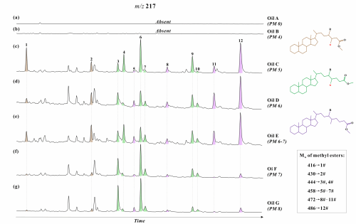 Beat365中文官方网站朱钢添副教授团队选取南襄盆地泌阳凹陷原油作为研究对象,通过气相色谱-质谱(GC-MS)、全二维气相色谱-飞行时间质谱(GC×GC/ToF-MS),系统分析了一系列母源关系接近但生物降解等级不同的原油样品中的甾烷酸分布。GC-MS分析结果表明,在未降解和低降解等级的原油样品中,未检出甾烷酸信号,只有在生物等级较高(规则甾烷开始发生明显降解)的原油样品中才能检测到甾烷酸,说明该类酸性生物标志物是甾烷的生物降解产物(图1)。