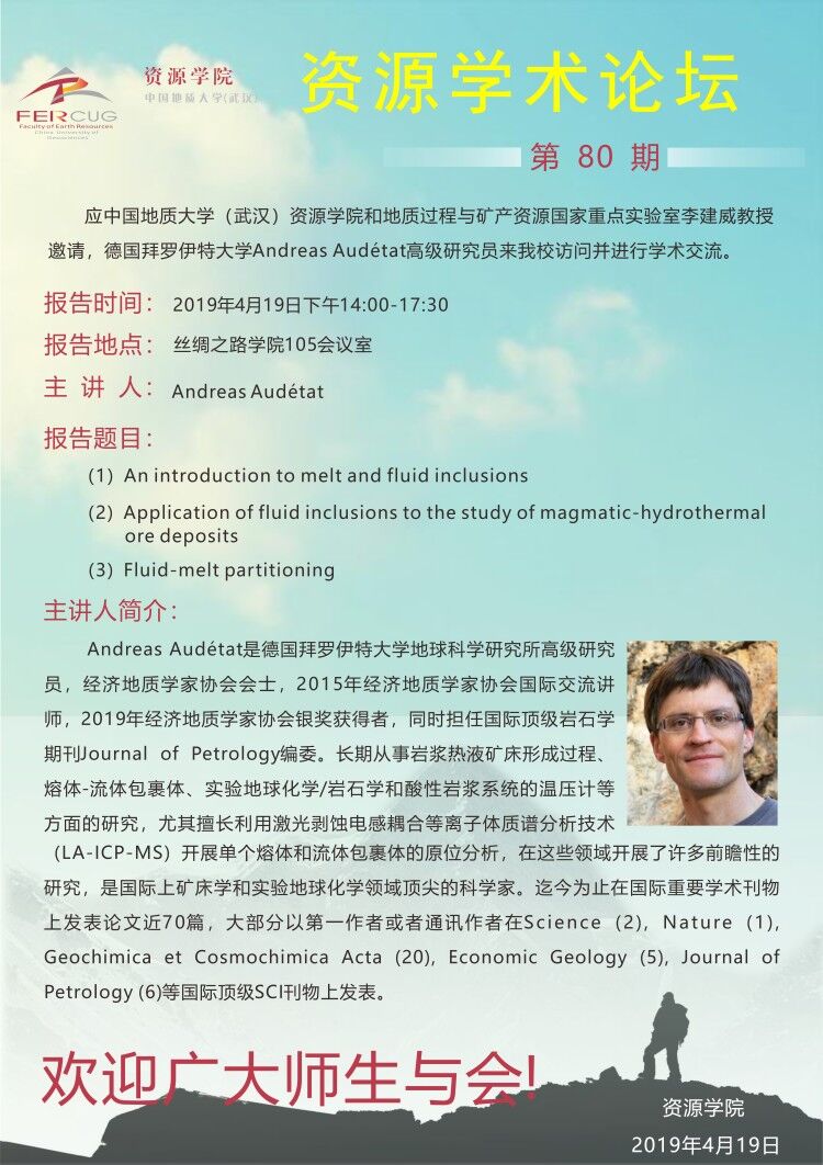 【4月19日】第80期资源学术论坛:Andreas Audetat学术报告