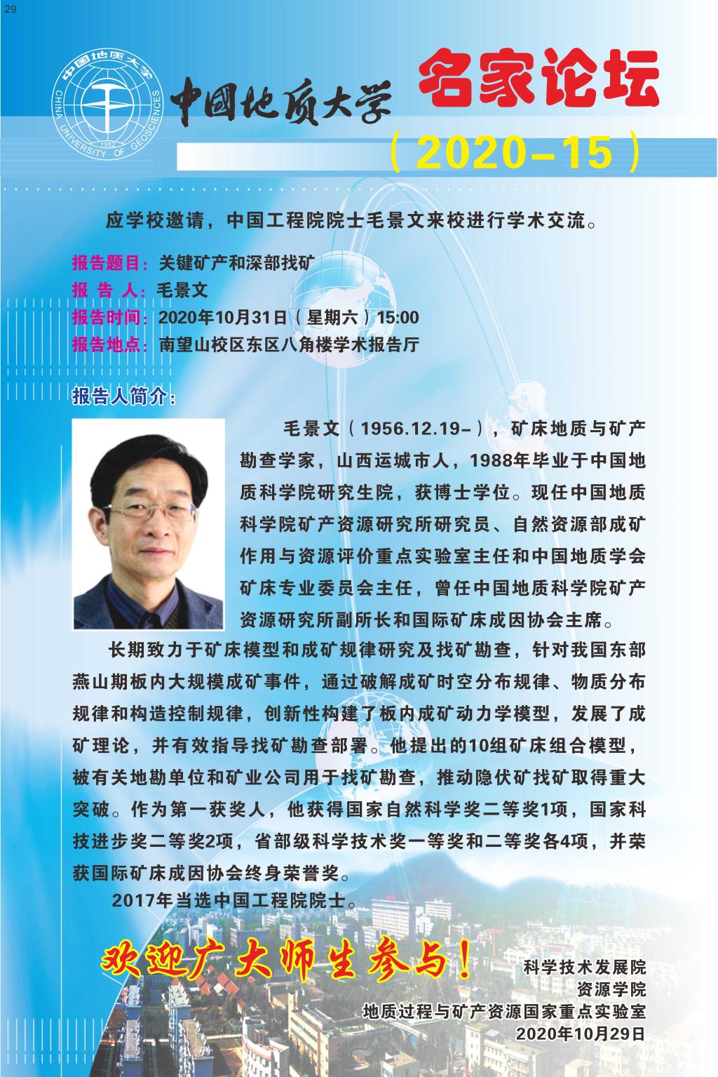 【10月31日】名家论坛2020-15期:毛景文院士学术报告