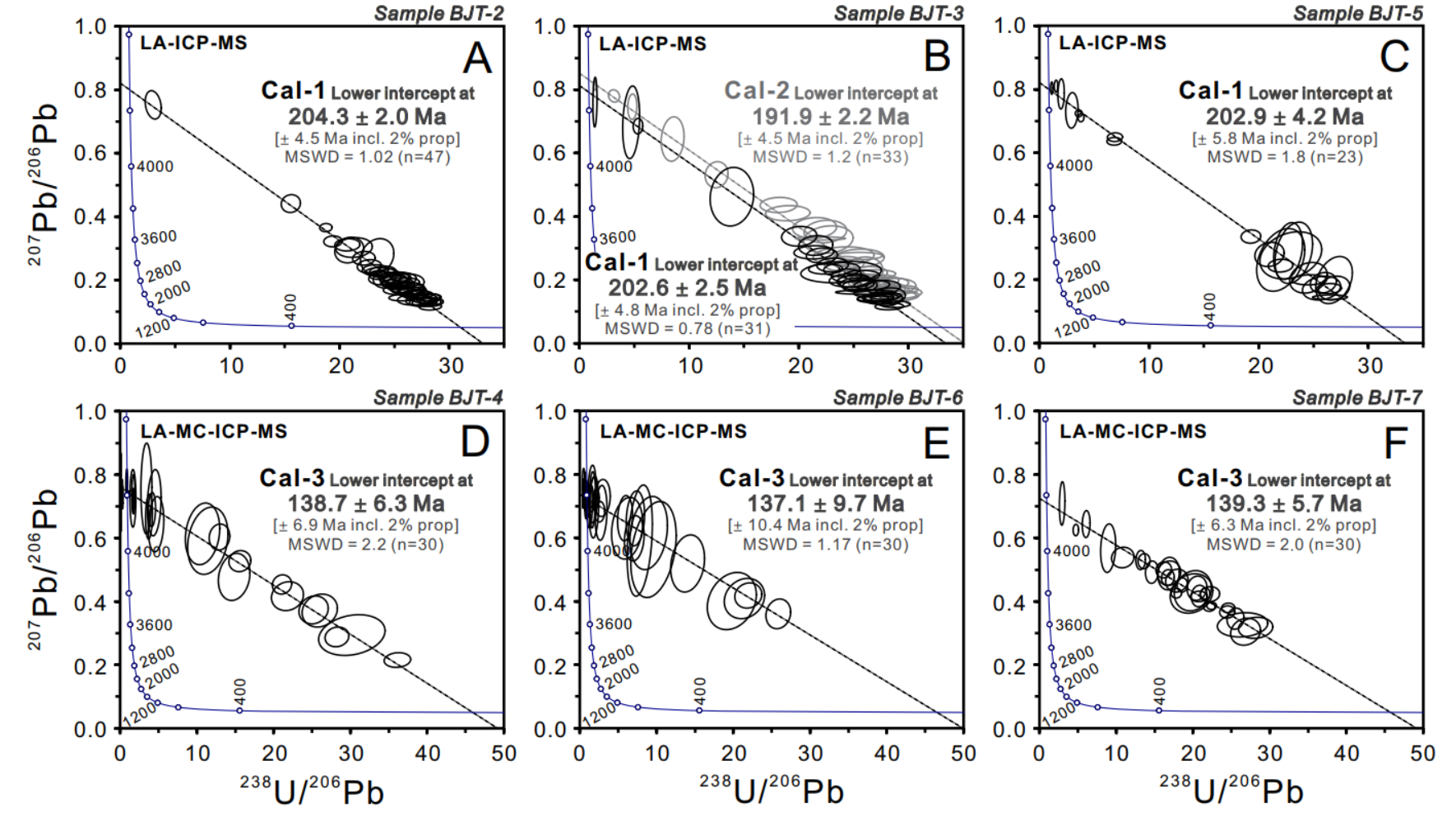 近年来随着分析技术的进步,LA-(MC)-ICP-MS方解石U-Pb测年法开始广泛应用于各种地质过程的年代学研究,但是迄今为止却鲜有在热液矿床中的成功应用。我们知道卡林型金矿床是一种赋存于不纯的海相碳酸盐岩地层中的低温热液金矿床,矿化蚀变特征上普遍发育脱碳酸盐化且方解石为这类矿床中非常常见的脉石矿物。鉴于此,本次研究我们选取了右江盆地规模最大、矿化特征最为典型的水银洞金矿床为研究对象,在详细的野外及矿相学观察的基础上,结合冷阴极发光特征、矿物共生组合及方解石的微区(微钻取样)微量元素和C-O-Sr同位素组成特征,识别出了三个世代的方解石(Cal_1−Cal_3):Cal_1为与热液石英和含砷黄铁矿结构共生的同成矿期方解石;Cal_2为Cal_1中叠加的与成矿不相关的构造或热液活动产物;Cal_3为与雄黄共生的开放空间充填物,可能为金成矿作用晚阶段方解石。LA-ICP-MS方解石U-Pb测年结果显示3件样品中的Cal_1形成于204.3−202.6 Ma(图4A-C),1件样品中的Cal_2形成于191.9 Ma(图4B)。Cal_3的U含量在0.003−0.006 ppm之间,利用LA-ICP-MS很难获得有效的成矿年龄数据,我们进而采用LA-MC-ICP-MS进行方解石U-Pb测年,分析结果显示3件样品中的Cal_3的其形成时间为139.3−137.1 Ma(图4D-F)。