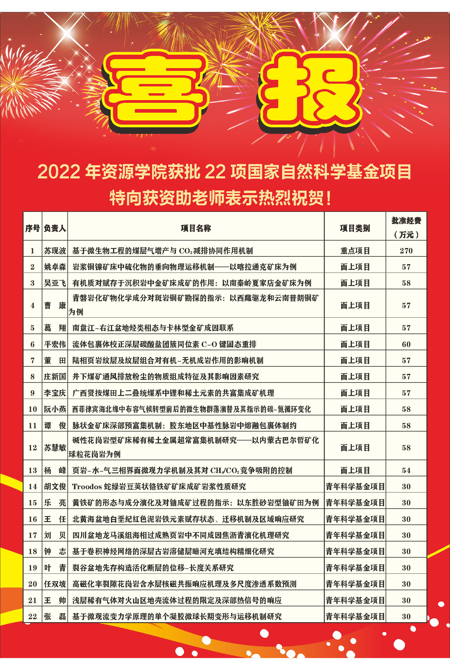 9月8日,国家自然科学基金委员会公布了2022年度集中接收期项目评审结果。我院基金立项在2019、2020、2021年3个大年的情况下,继续保持良好发展态势,共有22个项目获得立项资助,其中,重点项目1项、面上项目12项、青年科学基金项目9项,资助直接经费1228万元。