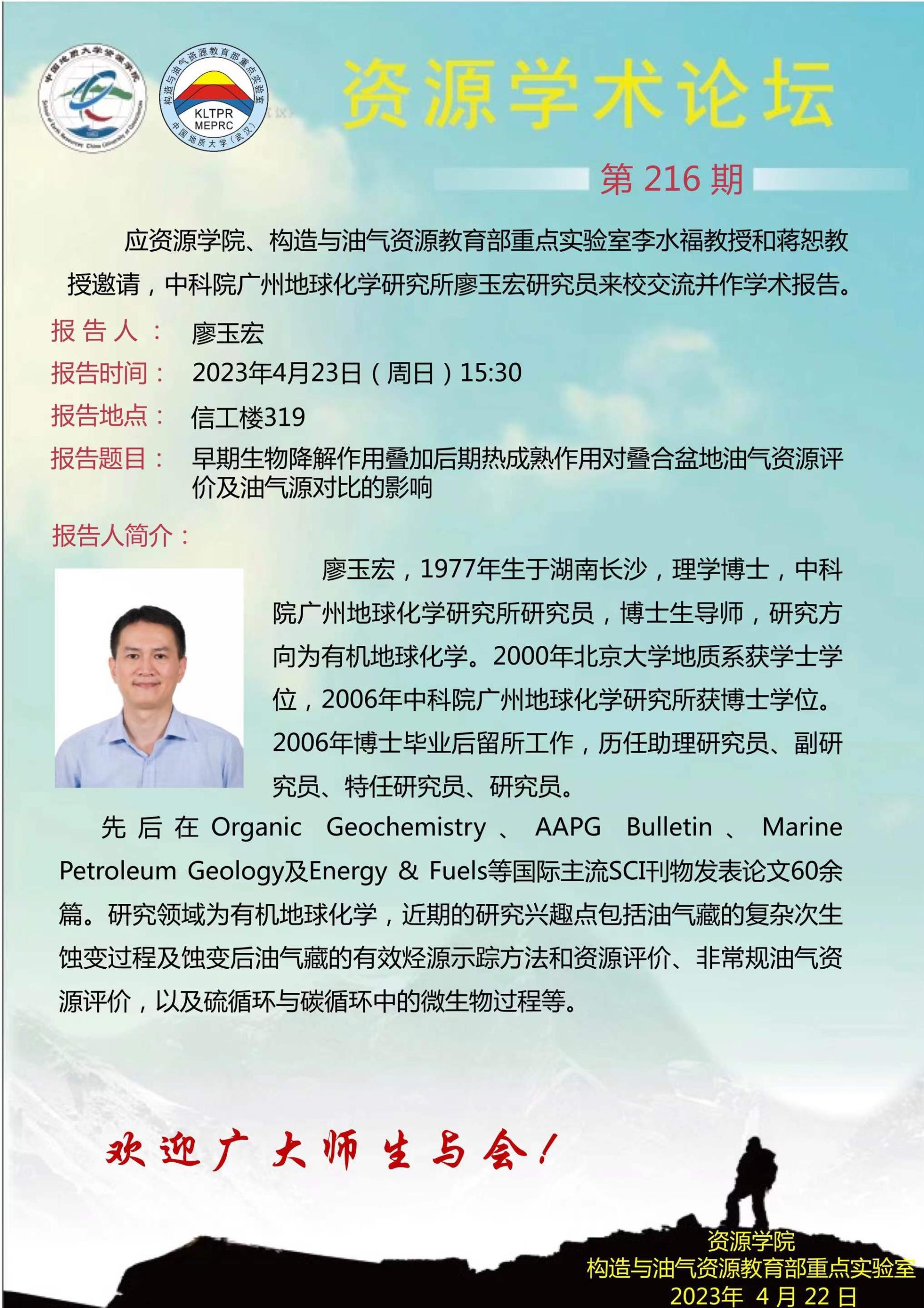 【4月23日】第216期资源学术论坛:廖玉宏学术报告