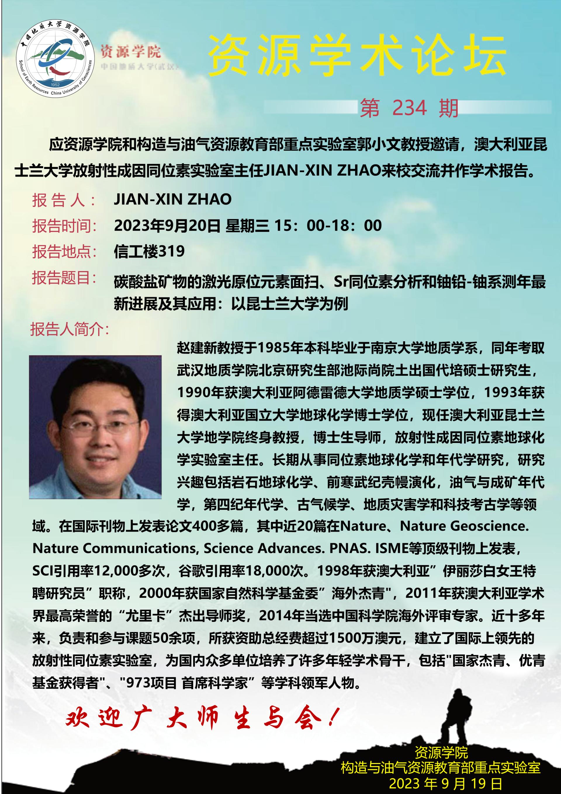 【9月20日】第234期资源学术论坛:JIAN-XIN ZHAO学术报告
