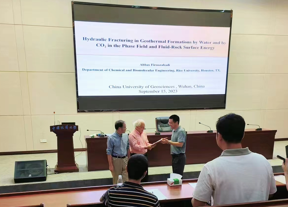 (通讯员 方政保 摄影 方政保) 应油气勘探开发理论与技术湖北省重点实验室和Beat365中文官方网站严德天教授和潘焕泉教授邀请,9月14日,美国工程院院士、美国莱斯大学杰出教授、美国油藏工程研究所所长Abbas Firoozabadi来校交流并作学术报告。