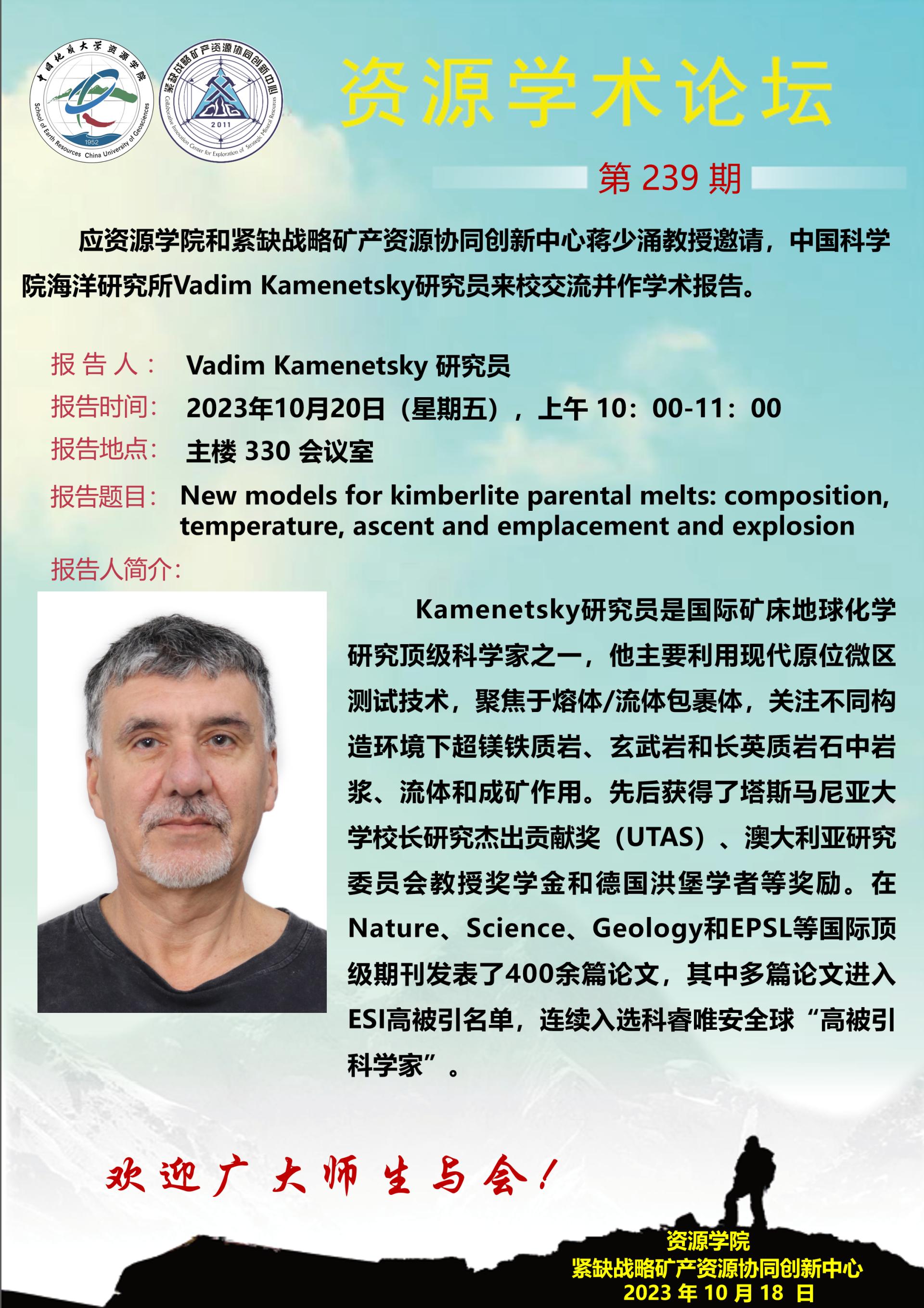 【10月20日】第239期资源学术论坛:Vadim Kamenetsky学术报告