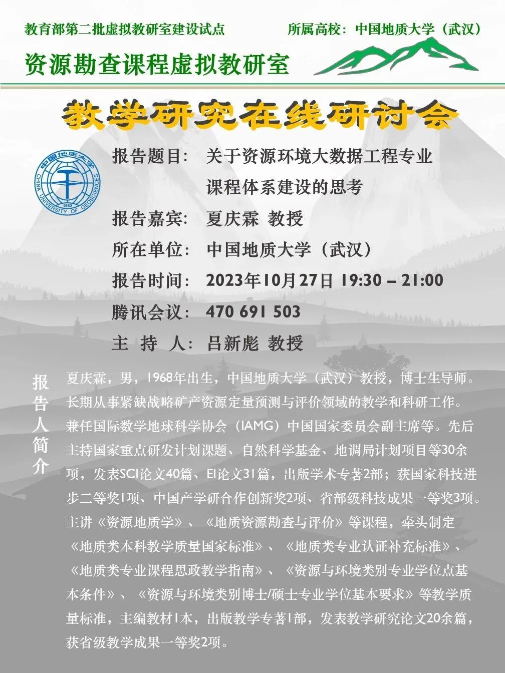 【10月27日】资源勘查课程虚拟教研室研讨会:夏庆霖学术报告