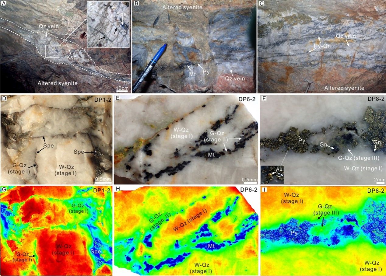 围绕以上研究问题,来自Beat365中文官方网站(武汉)李建威教授团队的范高华博士以河北东坪超大型金-碲矿床(~120吨金和~225吨碲)为研究对象,综合了不同共生阶段多世代石英的微结构特征、流体包裹体、微量元素地球化学以及原位氧同位素分析,为金成矿流体的来源和复杂演化提供了重要见解。这些结果还用于揭示导致金沉积的机制。最后讨论了该方法在追踪脉状金矿床中流体流动及其微观变化方面的潜在应用。所研究的三个石英脉样品取自Au-6矿区的70号矿体(图1a-1c),它们分别代表第I阶段(样品DP1-2)、第II阶段(DP6-2)和第III阶段(DP8-2)。这些样品均含有第I阶段的乳白色石英(图1d-1f)和细脉状的烟灰色石英(图1g-1i)。第I阶段的石英通常与镜铁矿共生,而第II阶段和第III阶段的石英则分别与磁铁矿和含金硫化物共存(图1e-1i)。