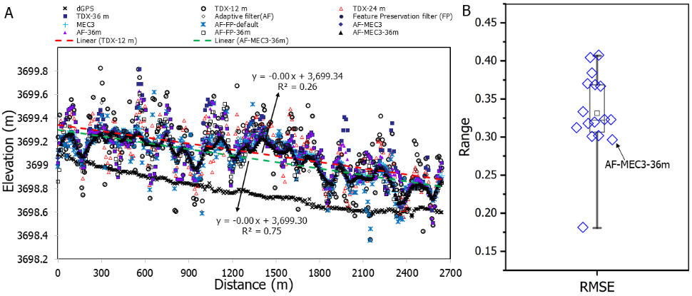 图2 TDX-12 m数据经过平滑和粗化处理后的结果(A)和与dGPS实测数据的比较(B)