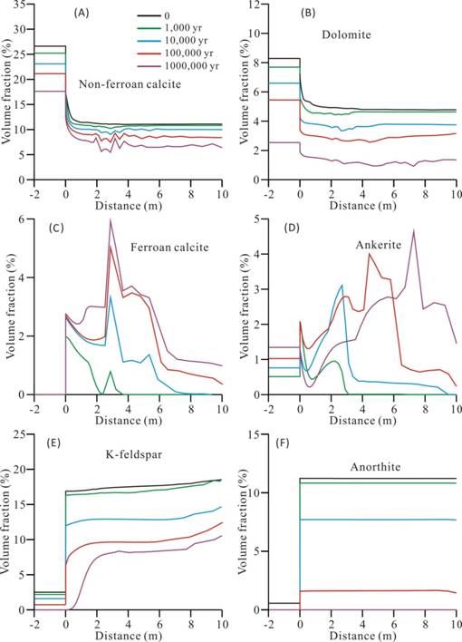 图1 砂-泥岩系统主要溶质离子浓度迁移变化(基于成岩数值模拟)