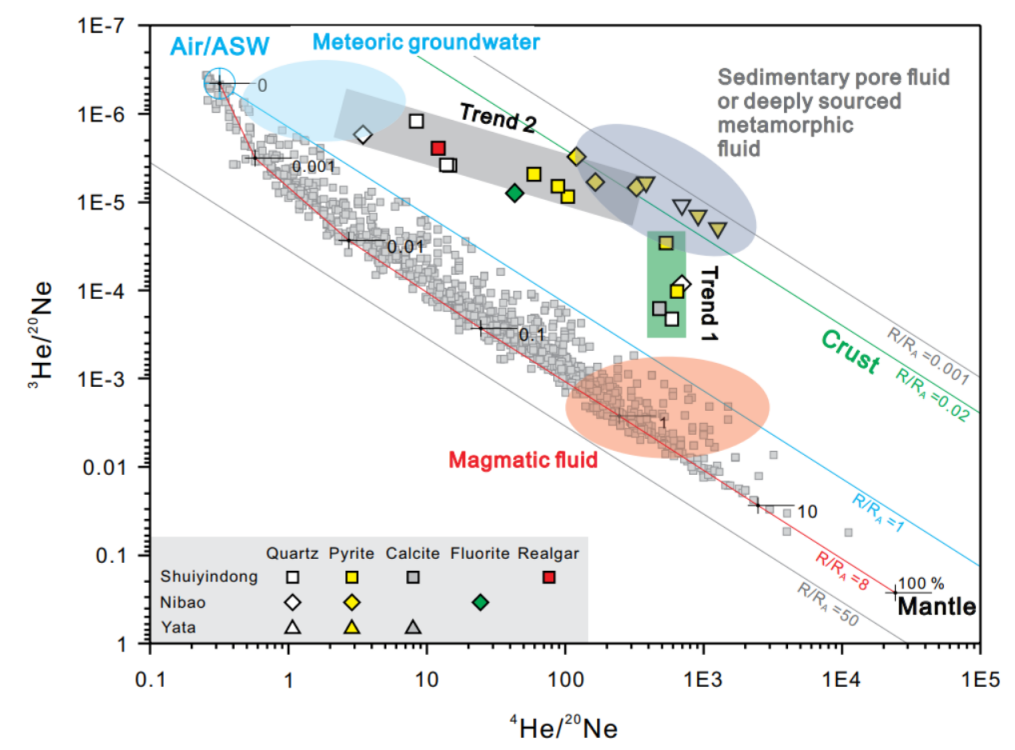Jin, X.Y., Hofstra, H.A., Hunt, G.A., Liu, J.Z., Yang, W., and Li, J.W*., 2020. Noble gases fingerprint the source and evolution of ore-forming fluids of Carlin-type gold deposits in the Golden Triangle, South China:Economic Geology, v. 115, p. 455-469. https://doi.org/10.5382/econgeo.4703