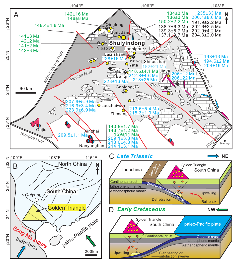 图5. A.右江盆地及外围已有同位素年龄数据,晚三叠世年龄为蓝色,早侏罗世年龄为冰蓝色,早白垩世年龄为绿色,本次获得的同位素年龄为黑色;B.华南及邻区构造地质简图;C.晚三叠世可能的金成矿地球动力学背景;D.早白垩世可能的金成矿地球动力学背景。蓝色和绿色箭头分别为晚三叠世古特提斯洋洋壳和早白垩世古太平洋板块的俯冲方向