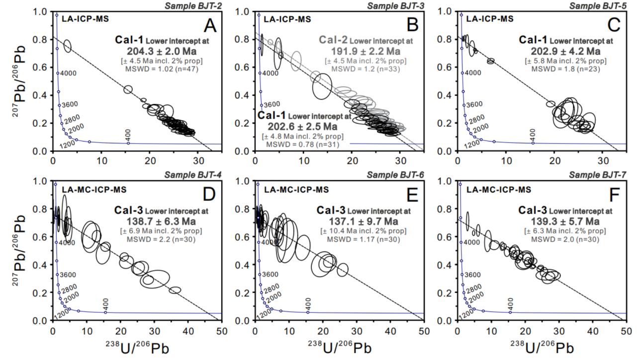 近年来随着分析技术的进步,LA-(MC)-ICP-MS方解石U-Pb测年法开始广泛应用于各种地质过程的年代学研究,但是迄今为止却鲜有在热液矿床中的成功应用。我们知道卡林型金矿床是一种赋存于不纯的海相碳酸盐岩地层中的低温热液金矿床,矿化蚀变特征上普遍发育脱碳酸盐化且方解石为这类矿床中非常常见的脉石矿物。鉴于此,本次研究我们选取了右江盆地规模最大、矿化特征最为典型的水银洞金矿床为研究对象,在详细的野外及矿相学观察的基础上,结合冷阴极发光特征、矿物共生组合及方解石的微区(微钻取样)微量元素和C-O-Sr同位素组成特征,识别出了三个世代的方解石(Cal_1−Cal_3):Cal_1为与热液石英和含砷黄铁矿结构共生的同成矿期方解石;Cal_2为Cal_1中叠加的与成矿不相关的构造或热液活动产物;Cal_3为与雄黄共生的开放空间充填物,可能为金成矿作用晚阶段方解石。LA-ICP-MS方解石U-Pb测年结果显示3件样品中的Cal_1形成于204.3−202.6 Ma(图4A-C),1件样品中的Cal_2形成于191.9 Ma(图4B)。Cal_3的U含量在0.003−0.006 ppm之间,利用LA-ICP-MS很难获得有效的成矿年龄数据,我们进而采用LA-MC-ICP-MS进行方解石U-Pb测年,分析结果显示3件样品中的Cal_3的其形成时间为139.3−137.1 Ma(图4D-F)。