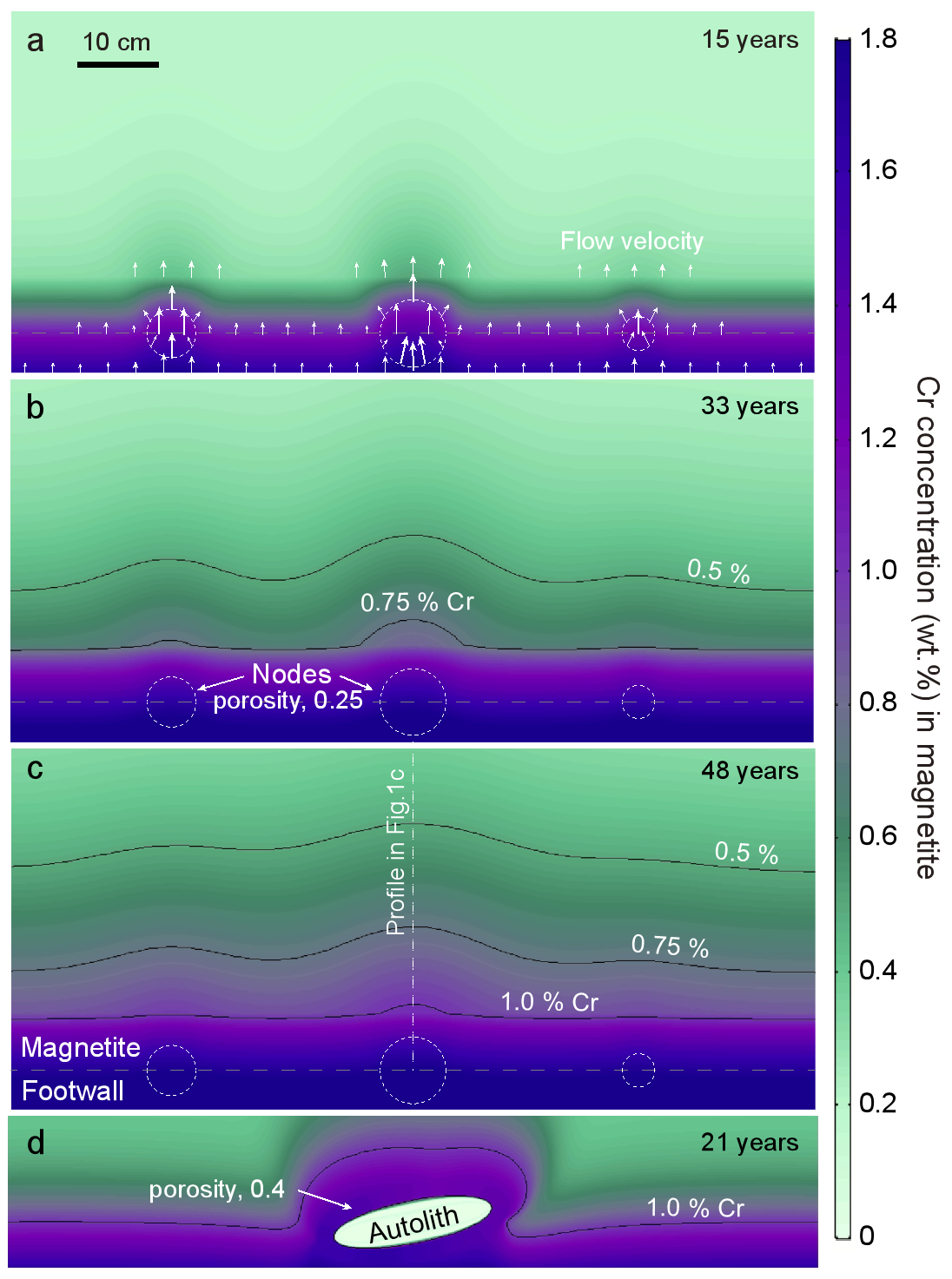 针对磁铁矿Cr含量的水平起伏特征,我们也尝试开展了熔体渗滤晶粥的二维有限元模拟工作。如果晶粥形成时岩浆房底部不甚平坦,或者其它因素的影响,会很容易造成磁铁矿晶粥层底部粒间熔体比例的非均匀分布,存在部分节点有着较高的粒间熔体比例,那么后续的渗滤熔体会更偏爱通过这些区域,使得相应位置的磁铁矿颗粒能够与更多的熔体发生反应和平衡,导致其Cr含量显著升高,表现出富Cr磁铁矿核的特征(图6a)。这一效应随着熔体的渗滤过程而继续向上延伸,最终表现为磁铁矿Cr含量在水平方向上的波浪状起伏(图6b, c),与2维扫面结果相一致(图4c)。如果晶粥中混入部分同源的斜长岩捕虏体,那么周缘的矿物堆积结构则会被打乱,使得捕虏体周缘具有很高的粒间熔体比例,那么更多的富Cr熔体会途径该区域而向上渗滤,最终导致周围磁铁矿含有较高的Cr含量(图6d),与野外的观测结果相吻合。