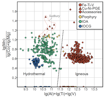 3.我们的研究表明Mg、Mn、Al、Ti、V、Co等元素可以较好的区分不同成因的高钛磁铁矿,在此基础上,我们进一步的将降维结果转换成一般形式的元素组合,并提出新的lg(Al)+lg (Ti)+lg(V) vs lg(Mn)/[lg(Co)+lg(Mg)]判别图解,用以区分岩浆和热液成因的高钛磁铁矿(图3)。新的判别图解可以避免原有判别图解带来的问题,在指示磁铁矿成因类型等方面提供更加丰富和准确地解释。