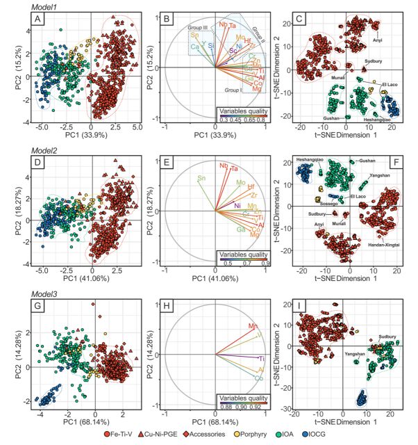 Beat365中文官方网站2021届硕士毕业生胡斌和博士后曾丽平,在导师赵新福教授指导下,收集了全球典型高温成矿系统,包括岩浆成因矿床(钒钛磁铁矿、铜镍硫化物矿床)、高温热液矿床(斑岩铜矿、IOCG矿床)、IOA矿床及相关的岩浆岩中已发表的原生高钛磁铁矿的LA-ICP-MS元素数据(图1),对数据集进行了两种无监督方法(主成分分析[PCA]和t分布随机邻域嵌入[t-SNE])的机器学习分析,通过大数据统计分析和建立机器学习模型,建立了不同成因高钛磁铁矿的微量元素组成特征。