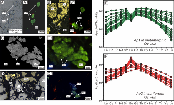 (1)根据阴极发光和微量元素特征,双旗山矿床变质和热液含金石英脉中发育三种类型的磷灰石(图1):Ap1形成于成矿前变质阶段,Ap2和Ap3在热液成矿阶段形成。Ap1富集中稀土,具有显著的负Eu异常,表明其是从Eu2+占主导地位的相对还原的变质流体中直接沉淀形成(图1);与金和含金硫化物紧密共生的Ap2和Ap3具有正Eu异常,显著区别于变质磷灰石(图1)。