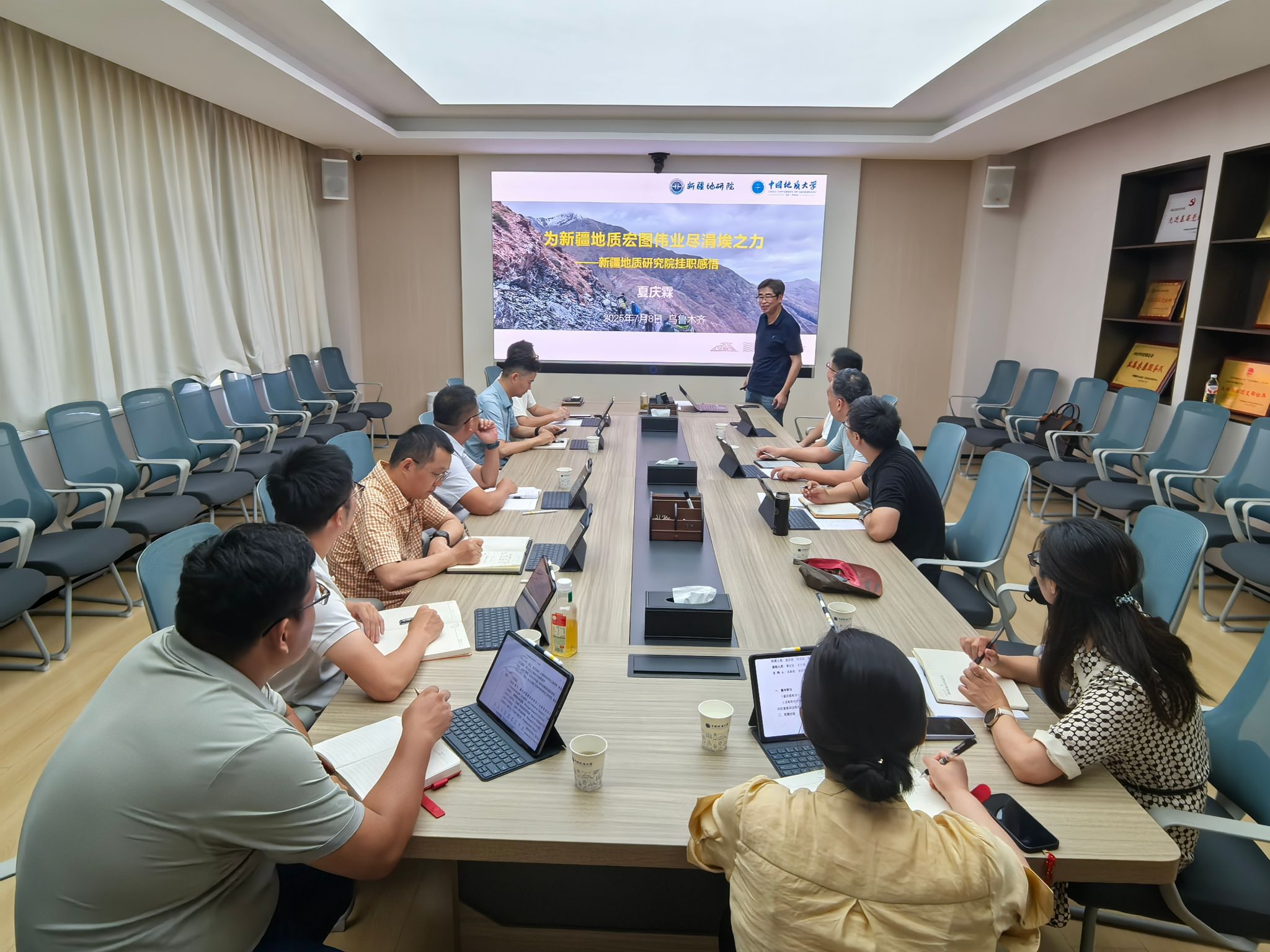资源信息工程系夏庆霖教授介绍新疆地质研究院挂职经历,围绕挂职期间工作内容、工作特点及成效、个人感悟等方面作了详细分享,并结合学院实际发展提出建议。与会人员围绕学院“拥抱新疆”战略的发展路径开展深入交流讨论。