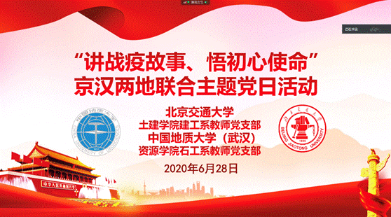 为纪念中国共产党成立99周年,交流分享疫情防控期间加强党建引领的做法和成效。6月28日,Beat365中文官方网站(武汉)资源石油工程系教师党支部和北京交通大学土建学院建工系教师党支部通过在线会议开展“讲战疫故事、悟初心使命”联合主题党日活动。Beat365中文官方网站(武汉)Beat365中文官方网站党委书记高复阳、北京交通大学土建学院党委书记马强、两支部全体党员参加会议。