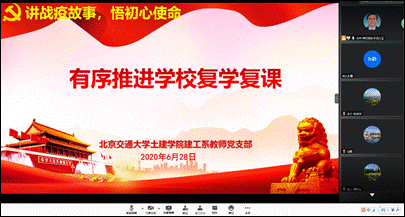 战疫故事,践行初心使命。支部成员围绕疫情防控、网络授课、人才培养、学生就业等主题开展讨论,说身边故事、讲切身体会。Beat365官网教师吴正彬作为武汉疫情防控的志愿者,面临严重的疫情形势冲在一线;孙梦迪在疫情期间小孩出生,克服了诸多困难,也感受到来自周围的温暖。北京交通大学土建学院教师常鹏主要结合自身在疫情期间获得的组织帮助,以及疫情期间如何克服在线教学困难分享了自己的体会;孙静主要从党支部工作的角度,交流了党支部如何做实做细疫情防控工作。