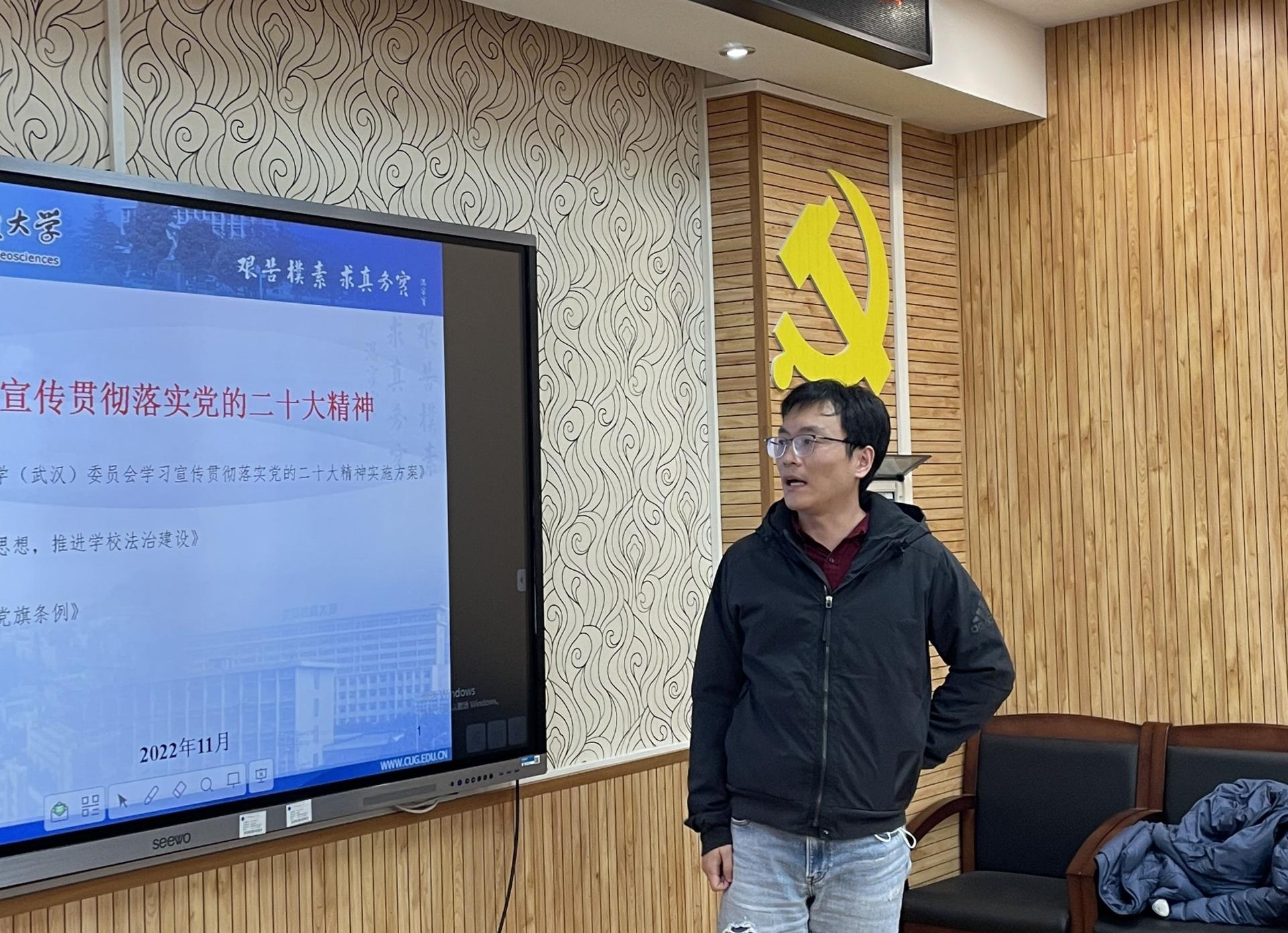 支部委员张琪同志领学了《中共Beat365中文官方网站(武汉)委员会学习宣传贯彻落实党的二十大精神实施方案》、习近平法治思想和《中国共产党党徽党旗条例》等内容。张琪同志强调要把全体师生员工的思想和认识统一到党的二十大精神上来,把智慧和力量凝聚到党的二十大确定的各项任务上来,凝聚到实现学院“十四五”规划确定的各项任务上来;要加强法律制度的日常学习,认真执行民法典,加强网络法治宣传教育;要规范使用中国共产党党徽党旗。与会者纷纷表示作为党员责任重大、使命光荣,要把党的二十大精神学习融入到实际教学、科研工作中。