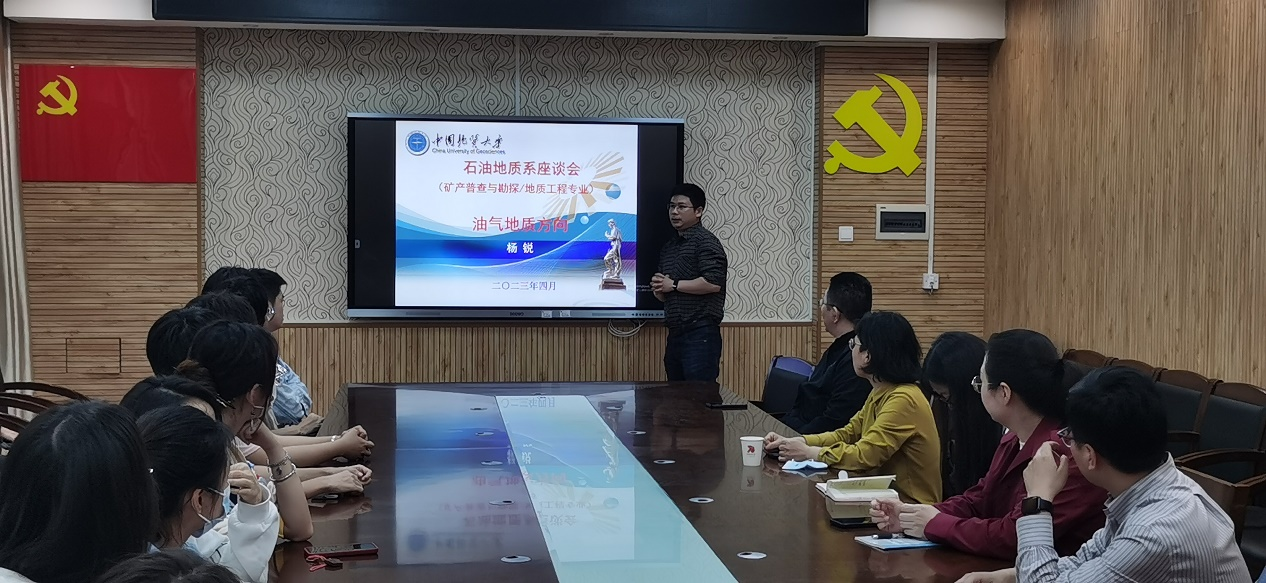 首先,杨锐教授介绍了石油地质系的专业特色、人才培养、导师团队、就业情况以及优秀毕业生代表。他谈到,石油地质系具有丰富多样的课堂教学、先进的实验设 备、广泛的学术交流、充足的科研经费、丰硕的科研成果、雄厚的师资力量和良好的就业前景。