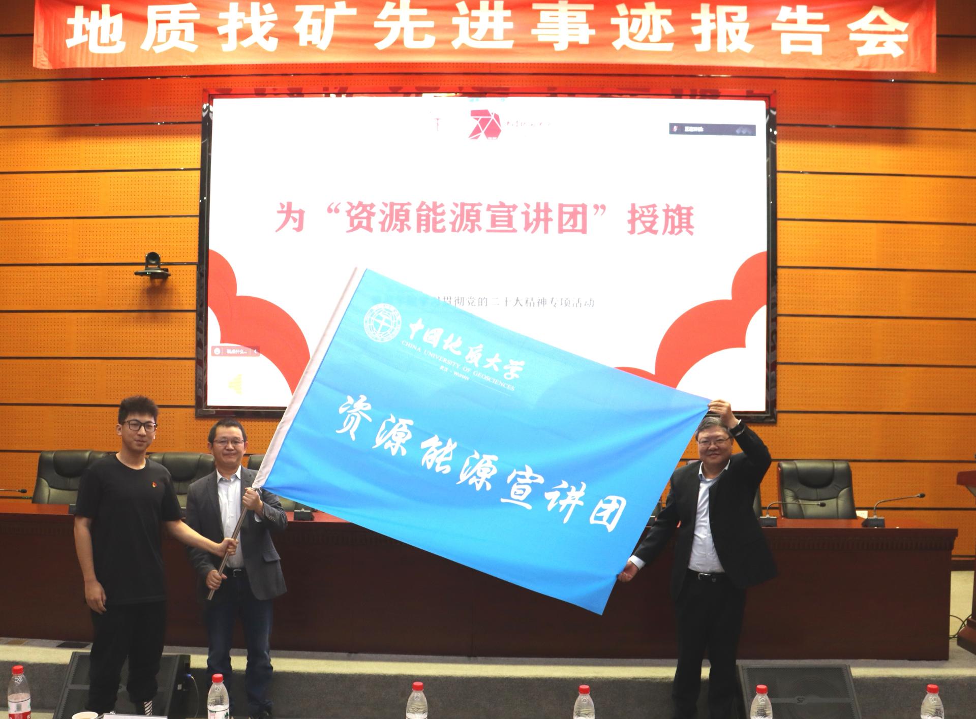 储祖旺为Beat365中文官方网站“资源能源宣讲团”授旗。武汉市委宣讲团成员、副院长沈传波教授,“志留纪”科普平台负责人、资源勘查工程专业2020级本科生吕骏腾代表接旗。