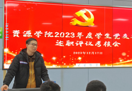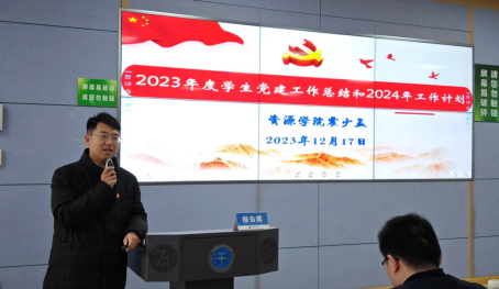 霍少孟作学生党建工作报告,介绍了学院党建“双创”工作部署和取得的成效,总结了学生党建工作2023年度工作和成效,并就2024年工作计划做了简要说明。他讲到,学院将持续推进样板支部培育,坚持抓基础和建品牌并重,特别是在制度建设、教育培训、过程管理、考核运用、队伍建设等方面下功夫,真正锻造引领找矿报国的红色引擎。