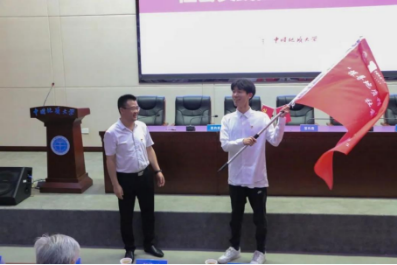 党委学生工作部邬海峰部长为“探寻地质精神 感触七秩荣光”学习之路社会实践团授旗。