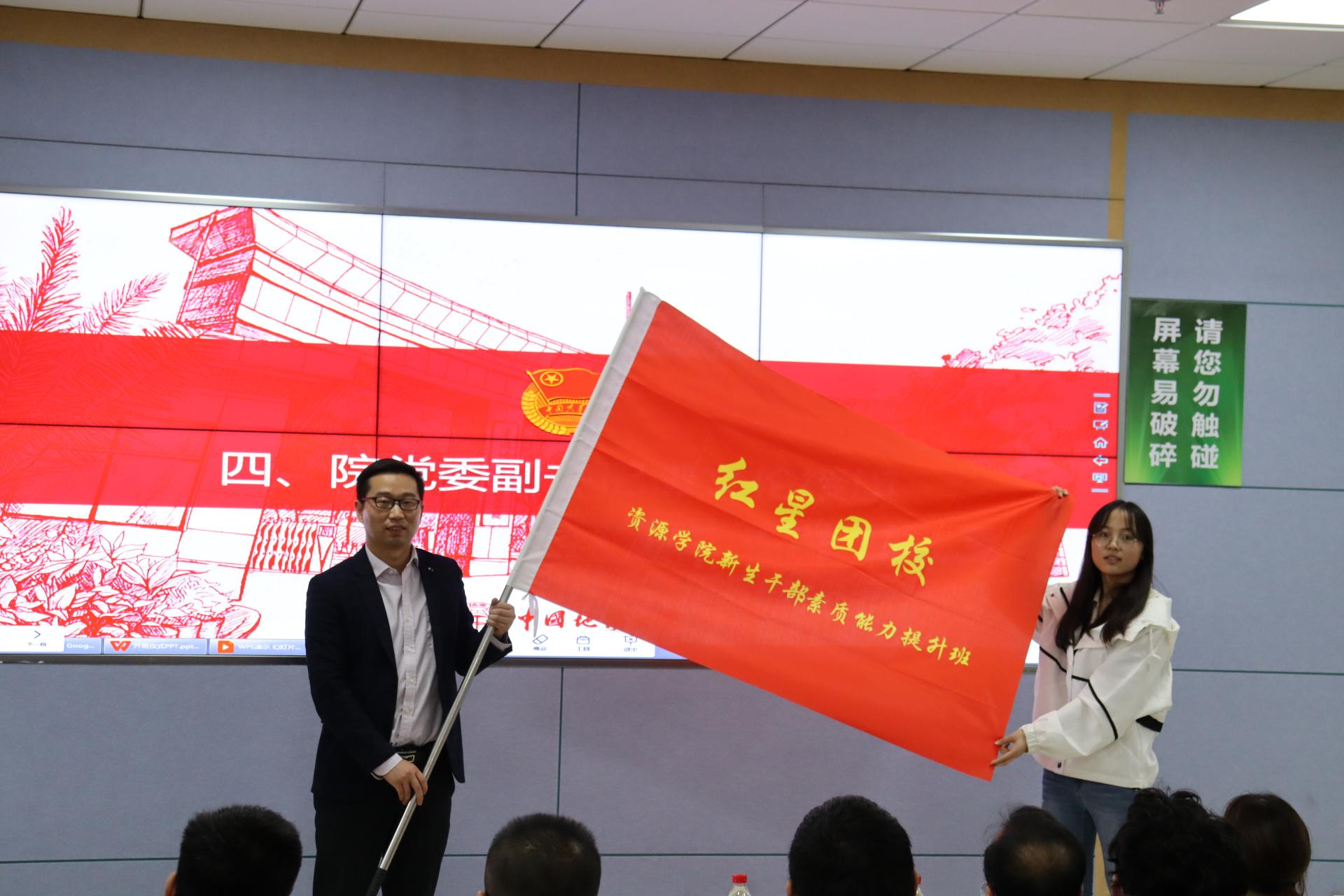 谭文伦为新学年团校授旗。