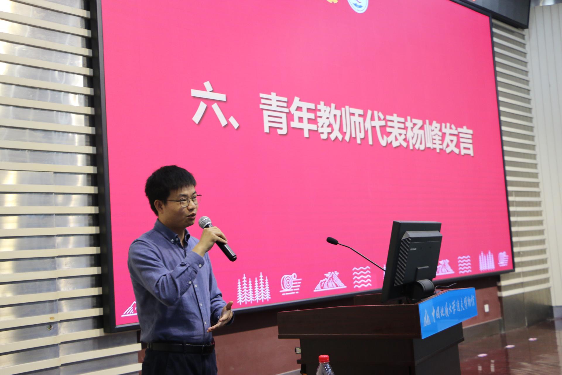 青年教师代表、石油工程系杨峰教授发言。他分享了自己从大学一度迷茫到成为一名高校教师和地质青年科技工作者的成长历程,勉励同学们将个人发展融入国家发展,敢于吃苦、勇于奋斗,勇担资源能源报国责任。