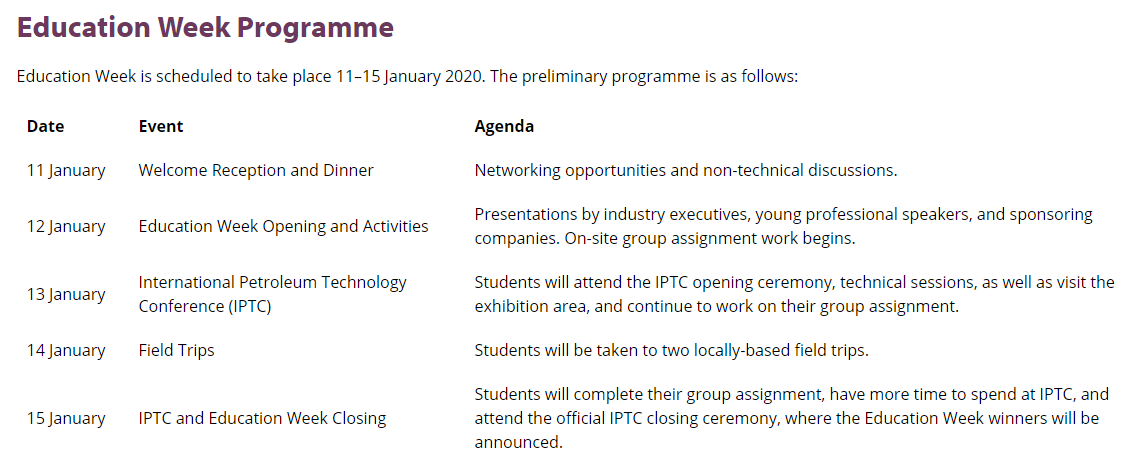 此次教育周预计将选出100名优秀的学生参加,IPTC将为选定的学生免费提供旅费和住宿费。活动时间:2020年1月11日至15日,地点:Dhahran EXPO,Kingdom of Saudi Arabia(沙特阿拉伯)。活动日程安排如下: