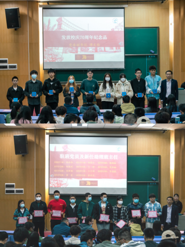 会上,谭文伦为学生代表赠送校庆70周年纪念徽章,为“党员责任区”驻班党员及新任助理班主任颁发聘书。