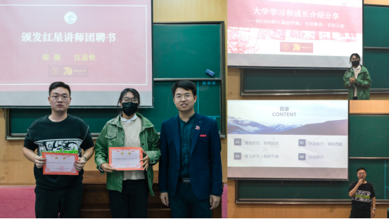 随后,第十期红星朋辈榜样论坛开讲。第十四期“李四光”计划学员、021194班班长胡强以《海阔凭鱼跃 天高任鸟飞》为题系统介绍了大学保研政策、学院推免情况,分享了大学成长经历,并围绕学习方法、科研启动、考研准备、课外生活与同学们进行了探讨。国家奖学金获得者、021203班江嘉怡以《不以物喜 不以己悲》为题,介绍了在大学学习中如何寻找动态平衡、消解焦虑情绪和学习的方法技巧;她讲到,在大学,选择干一件让自己感觉到快乐的事并持久坚持,会很幸福,专业学习就是最好的选择。霍少孟为胡强、江嘉怡颁发Beat365中文官方网站“红星讲师团”聘书。