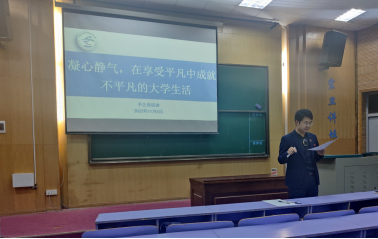霍少孟带领同学回顾了春季学期年级大事、系统剖析了大一学年学习情况,介绍了《第二学年综合测评实施细则》修订情况,并从感触伟大时代荣光、推进开展生涯规划、加强学习科研风气建设等方面介绍了本学年工作规划。他以《凝心静气,在享受平凡中成就不平凡的大学生活》为题,从希望大家关心父母、增强发展的忧患、彼此的思维碰撞、理性思维、集体观念、持久快乐、怎样保持公信力、如何做好辅导员工作、未来驶向何方、什么才是人生的光十个方面介绍近期所思所想。对于在学校学院各级学生组织任职的同学,他讲到,“担当责任在于,不轻易选择,更不轻易放弃”。他讲到,大家要结合70周年校庆,学习校史校情,积极参观、有组织参观校史馆和70周年校庆特别展览。