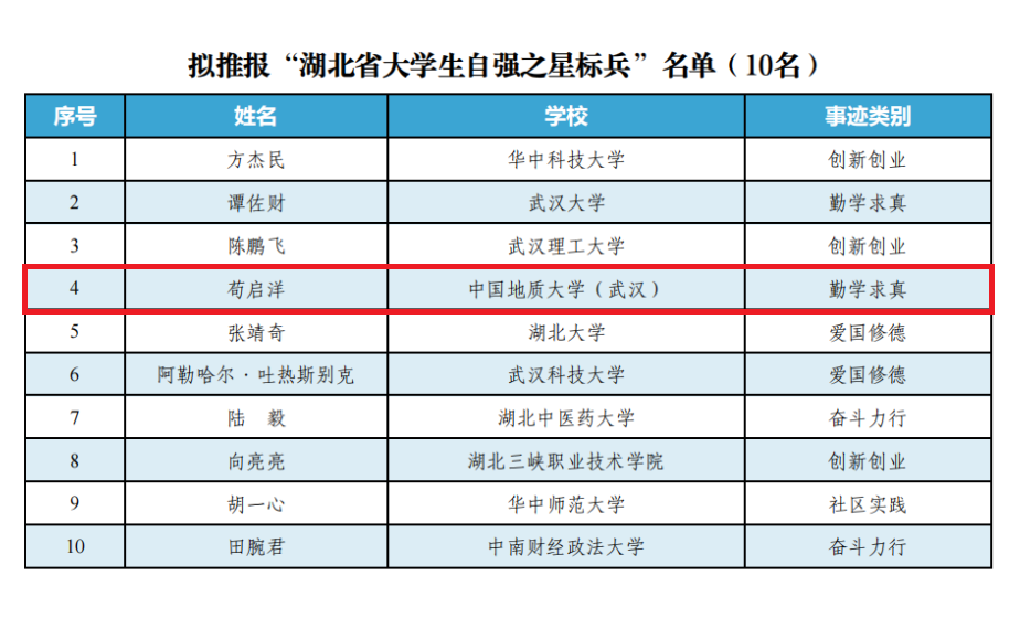 今年4月,团湖北省委学校部、湖北省学联秘书处启动了2022年度“大学生自强之星”推报工作。经校院推荐、省级遴选、宣传展示、专家评审等环节,我院2020级矿产普查与勘探专业苟启洋同学荣获2022年度“湖北省大学生自强之星标兵”(湖北省仅10名),同时被等额推报 “中国大学生自强之星”评选。