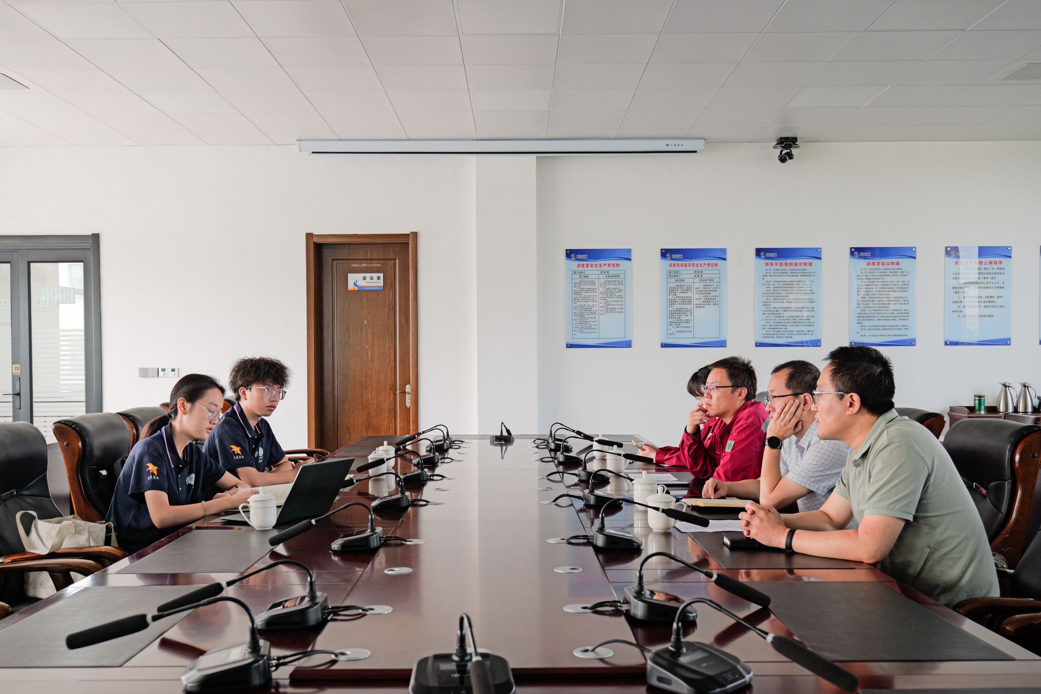 参观结束后,实践团与单位党群工作部部长杨扬、生产技术部副主办康勇、生产技术部科员孟思雅进行座谈交流。实践团介绍了来访目的和校院的基本情况,并针对未来就业选择和职业生涯规划等内容进行提问。单位与会代表进行耐心的答疑解惑。