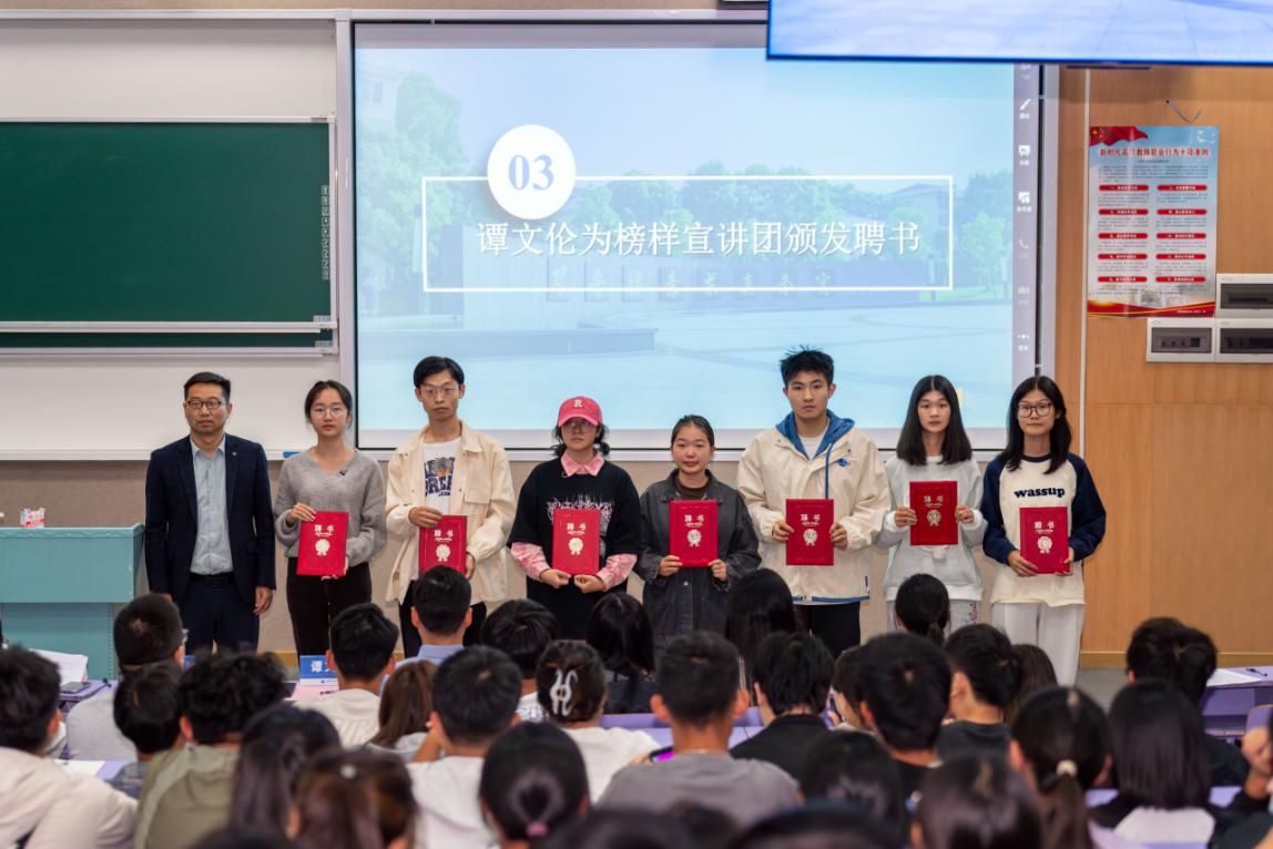 聘用仪式环节,党委副书记谭文伦为榜样宣讲团成员代表颁发聘书。榜样宣讲团来自学院近年来国家奖学金获得者、学生“双创”与行业学科竞赛获奖者、推免保研学生等组成,他们将深入班级分享自己的成长历程,发挥榜样示范引领作用。