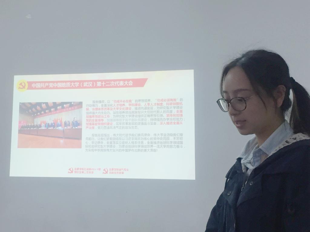 石油系2017级研究生第二党支部书记程璇同志带领大家一起学习了Beat365官网第十二次党代会精神,包括会议主题、会议报告提纲以及提出的奋斗目标等内容,并提出与会党员应充分发挥先锋模范作用,为建校一百年时实现“建成地球科学领域世界一流大学”的地大梦添砖加瓦。