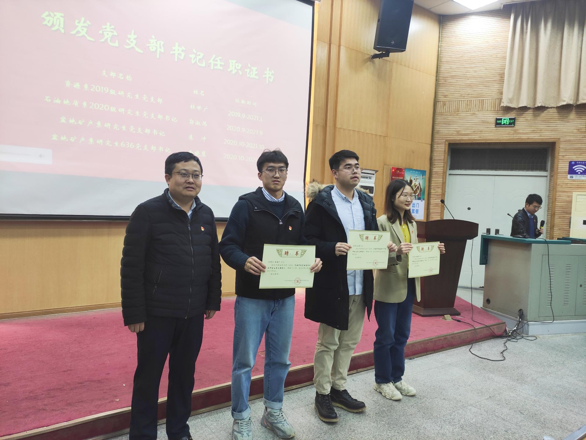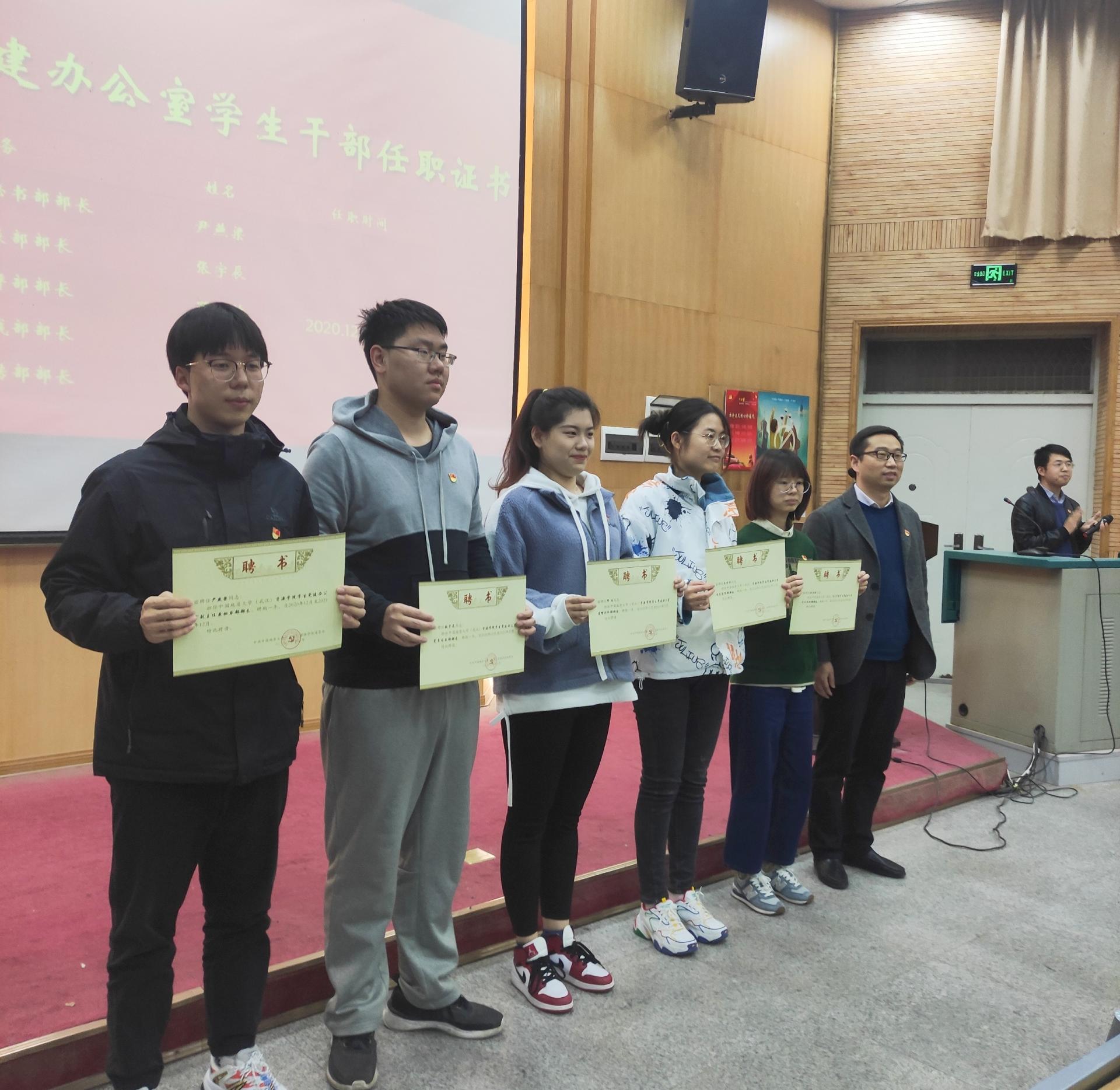 会上,高复阳、谭文伦分别为任期时间为2020-2021学年的学生党支部书记、党建工作办公室学生干部颁发了任职证书。