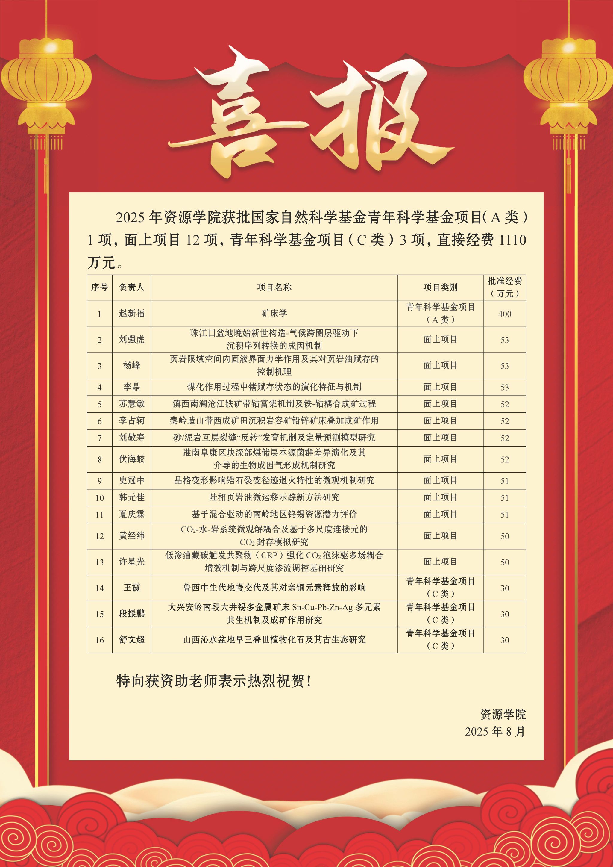 8月27日,国家自然科学基金委员会公布了2025年集中接收期项目评审结果,Beat365中文官方网站获批资助项目共16项。其中,青年科学基金项目(A类)1项,面上项目12项,青年科学基金项目(C类)3项。项目直接经费达1110万元,较2024年增长63.2%,经费数量位居全校第二。