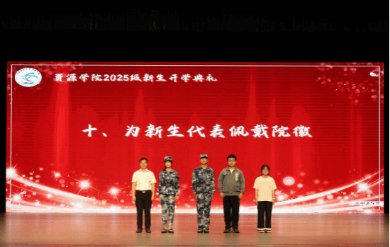 学院党委书记汪再奇老师为新生代表佩戴院徽。