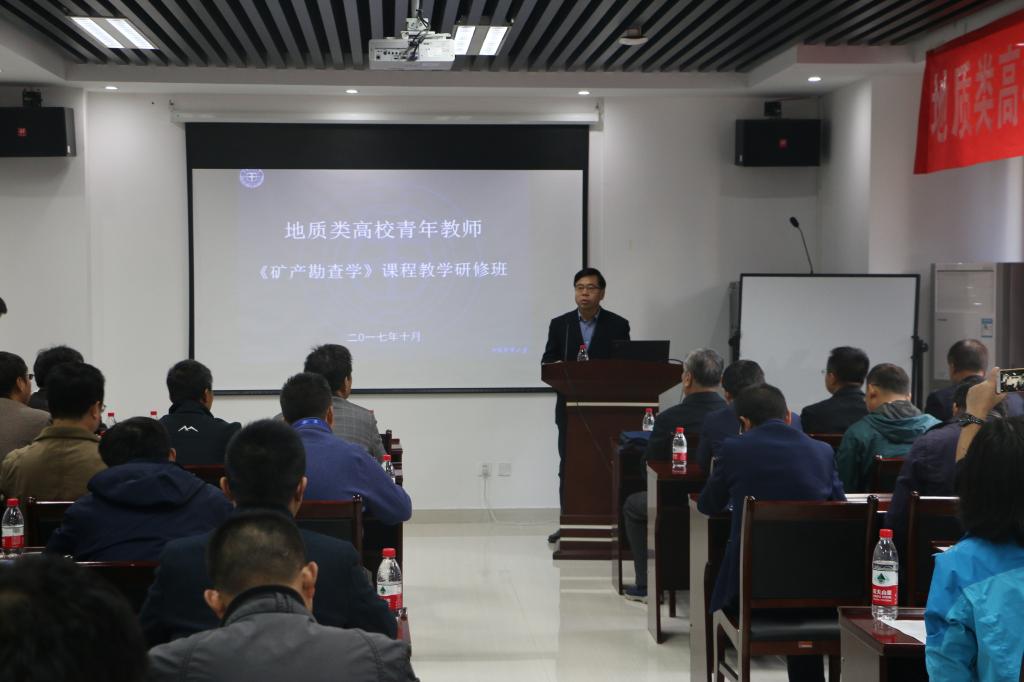 由教育部高等学校地质类专业教学指导委员会主办,Beat365中文官方网站(武汉)承办的《矿产勘查学》课程教学研修班于2017年10月21日-22日在Beat365中文官方网站(武汉)丝绸之路学院105会议室举行。Beat365中文官方网站(武汉)唐辉明副校长莅临开幕式并发言,Beat365中文官方网站李建威院长、夏庆霖教授、石万忠副院长分别担任会议主持,来自全国19个高校的资源勘查工程专业或相近专业的青年教师参加了本次研修班。