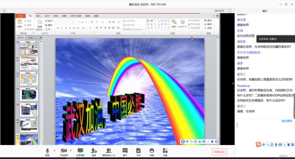 本次报告以线上互动的方式开展,突破空间局限,让研究学习更纯粹、更自由。石万忠教授的《非常规油气研究中几个关键科学问题及解决方法》从我国油气战略谈起,就页岩气、致密砂岩气研究中的关键科学问题逐一展开,充分体现了地大人对国家能源发展的担当和使命;任建业教授的《东南亚汇聚板块系统、南海的形成演化过程与深水油气资源勘探》,从板块演化的宏观视角展开,就南海的构造演化及对油气勘探的影响进行了深入探讨。