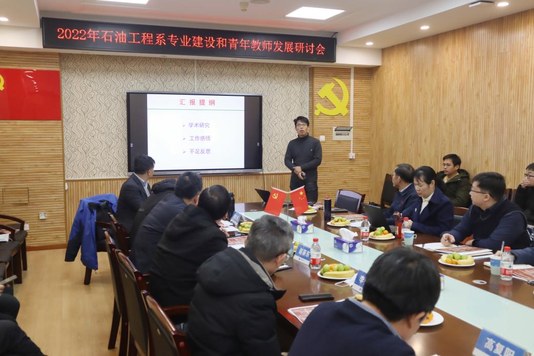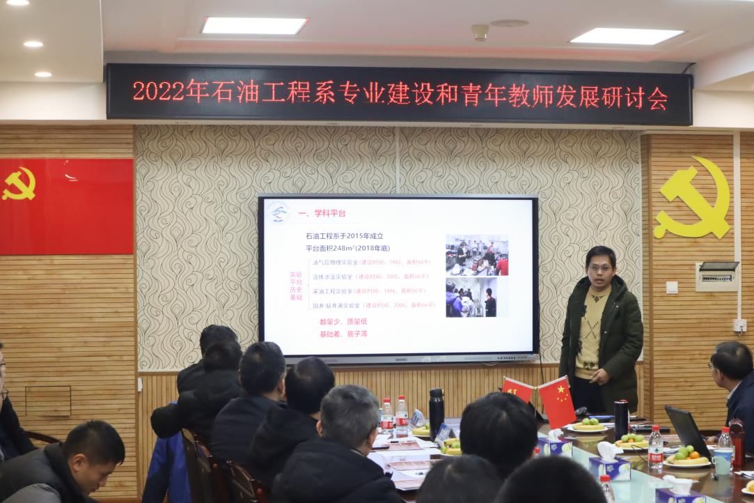 院长李建威教授讲话。他指出,专业建设和青年教师是石油工程系茁壮成长和良性发展的重点,专业建设需要青年教师积极参与和作为,而青年教师的发展也需要一流本科专业作为平台;他从学科建设、专业建设、实验室建设、队伍建设等方面分析了近些年来所取得的成就,同时也指出发展过程中存在的不足之处。他希望老师们进一步地统一思想,凝聚共识,增强主人翁意识,为学院和学科建设积极贡献每一个人的全部力量。
