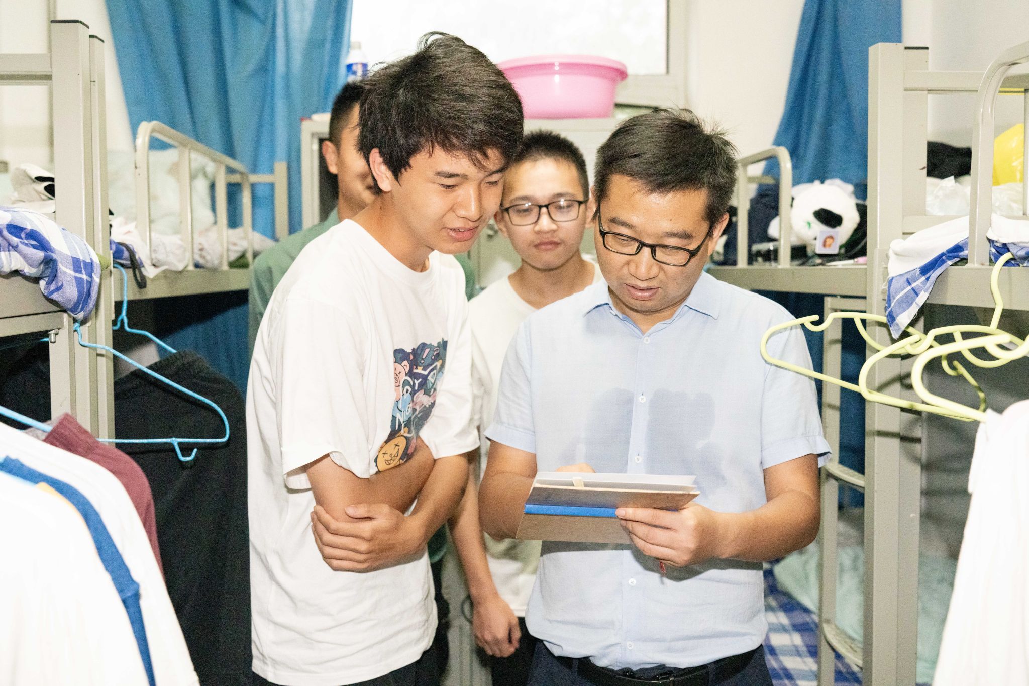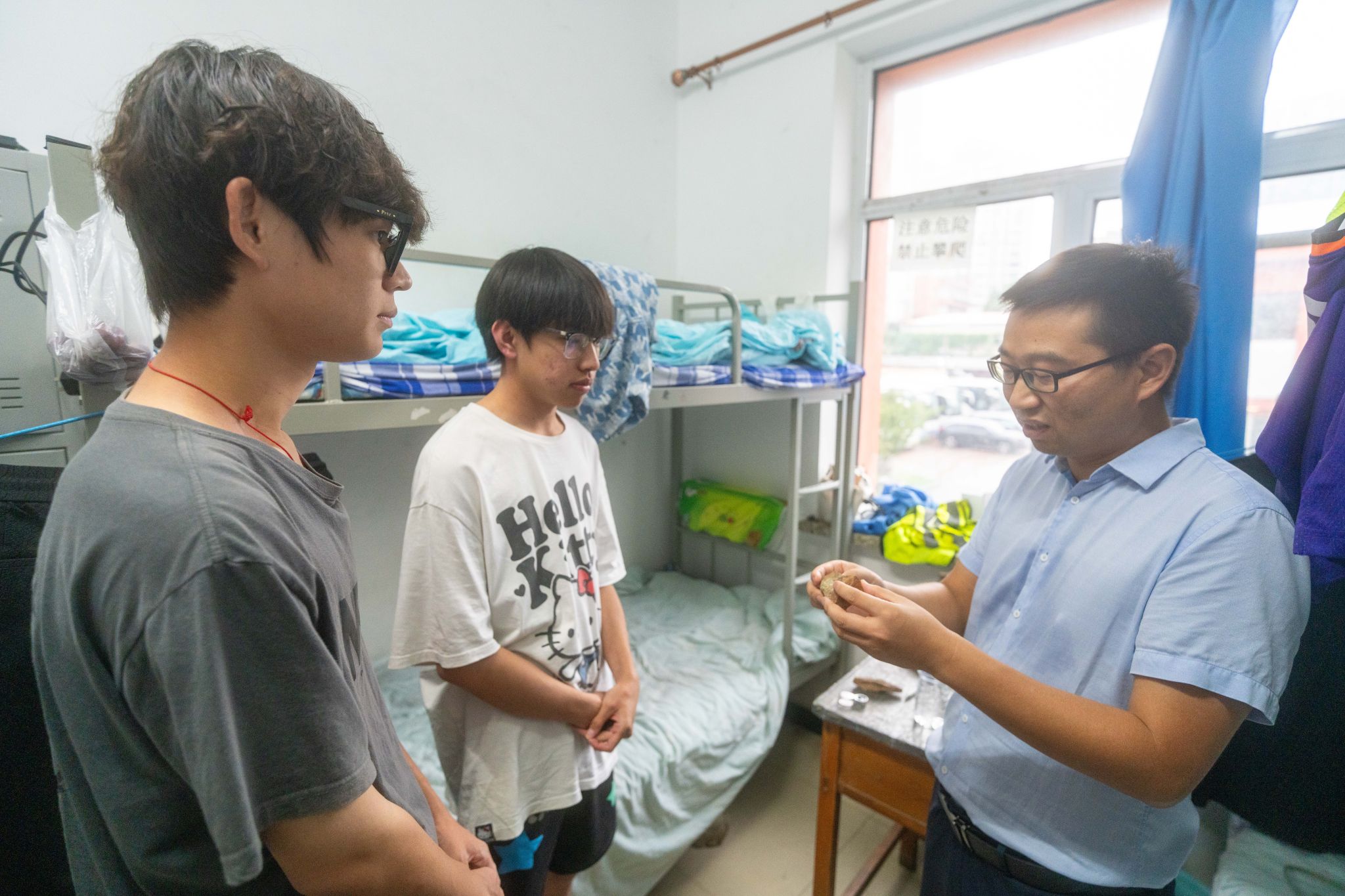 随后,谭文伦一行走访学生宿舍。他与同学们亲切交谈,查阅学生野簿和野外样品,了解在站学习和生活状况。