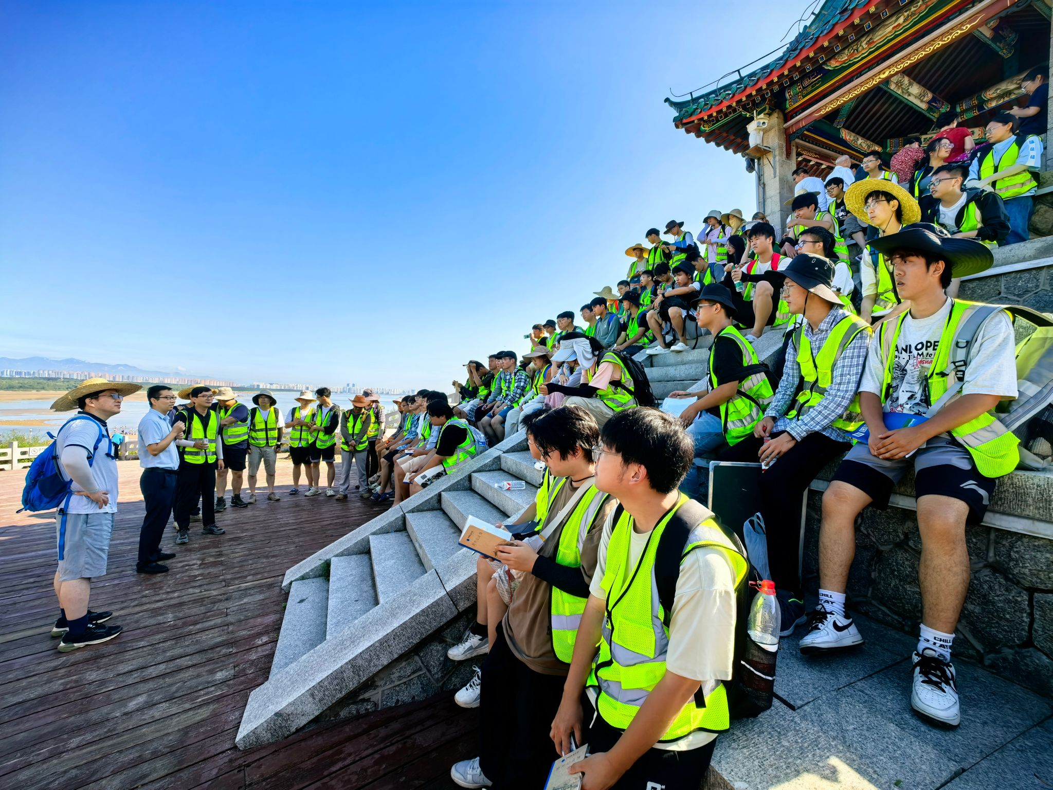 8月24日上午,谭文伦一行参加鸽子窝野外路线实习,与师生一起观察海蚀基岩海岸地貌,与同学们交流学习心得。他表示,重视实践教学是学校长期保持的优良传统和办学特色,实践教学又是地质学子成长成才的重要环节,希望同学们珍惜此次实习机会。他勉励同学们要学会“自找苦吃”,在实践中锻炼吃苦精神,磨炼坚强意志,增强发现问题、分析问题、解决问题的能力,夯实专业基础,锤炼过硬本领,做“敢于吃苦、甘于吃苦、善于吃苦”的新时代地质好青年。