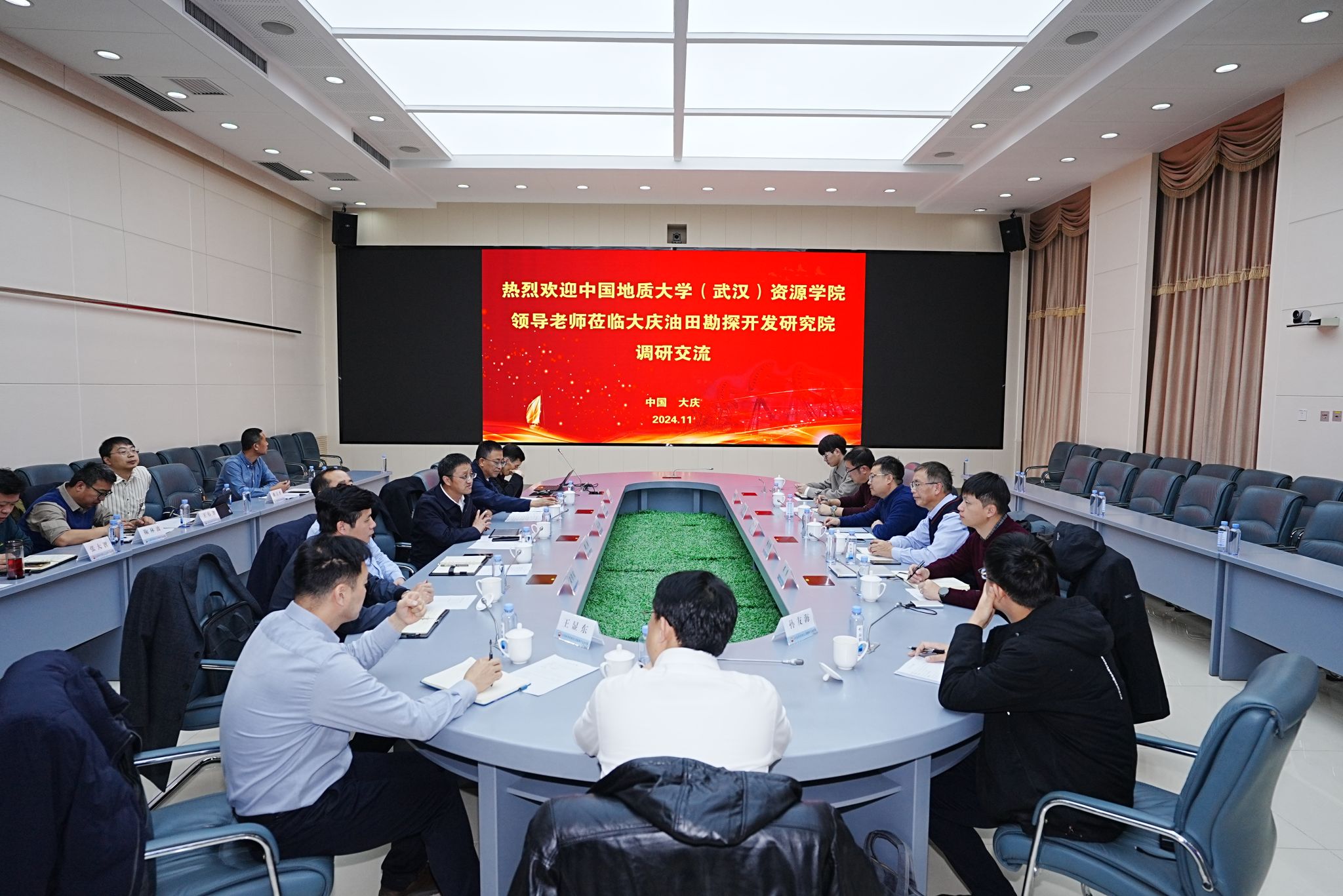 郭军辉对高复阳一行的到来表示热烈的欢迎。他指出,大庆油田与Beat365中文官方网站(武汉)有着深厚的合作基础,地大(武汉)学科实力强劲、人才培养质量扎实。他希望双方持续发扬优良合作传统,建立务实产学研合作机制,共同为国家能源安全做出应有贡献。