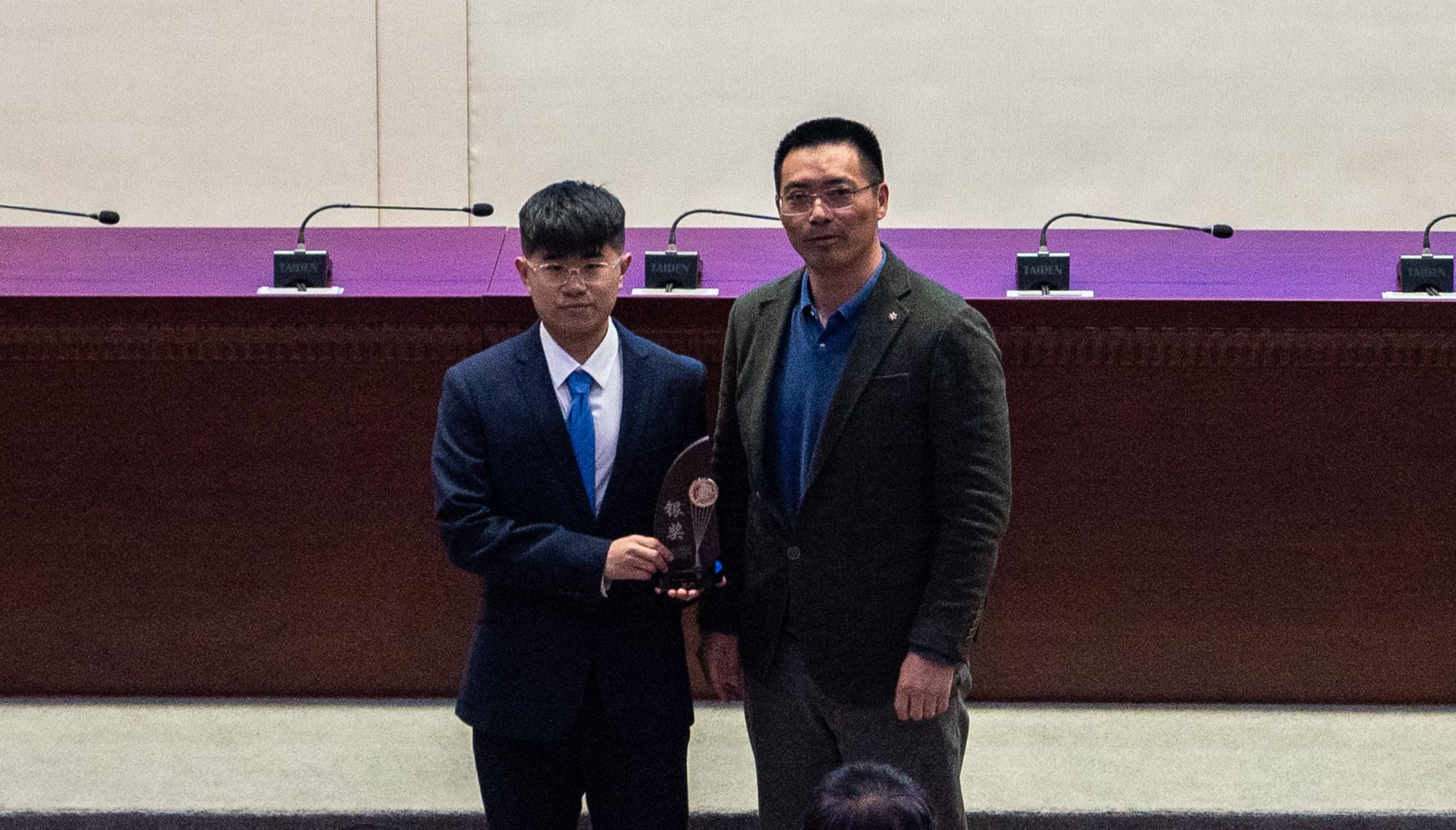 Beat365中文官方网站院长严德天为“智热星合”创业团队颁发“第十八届大学生挑战杯创业计划竞赛”银奖奖杯。